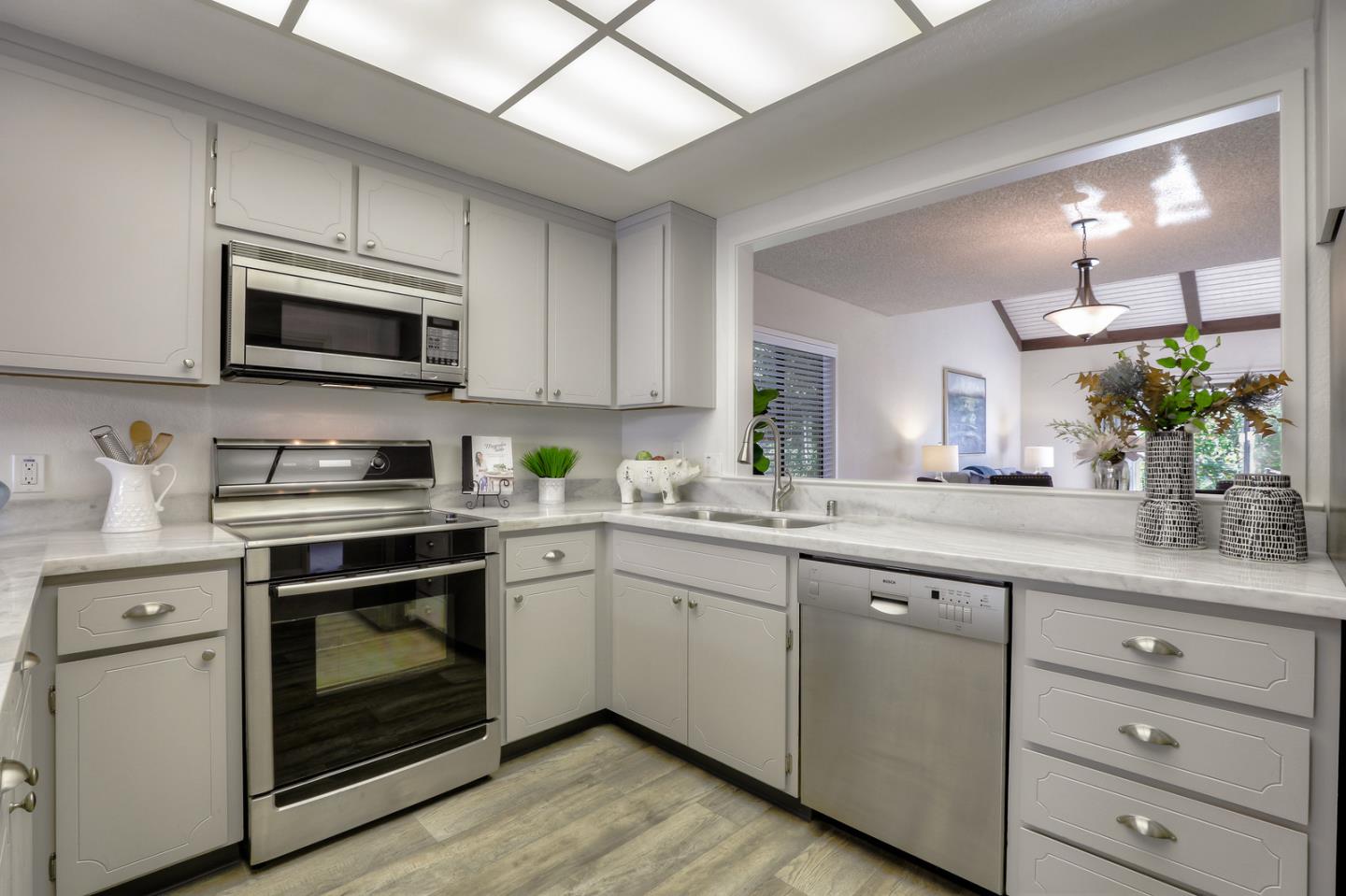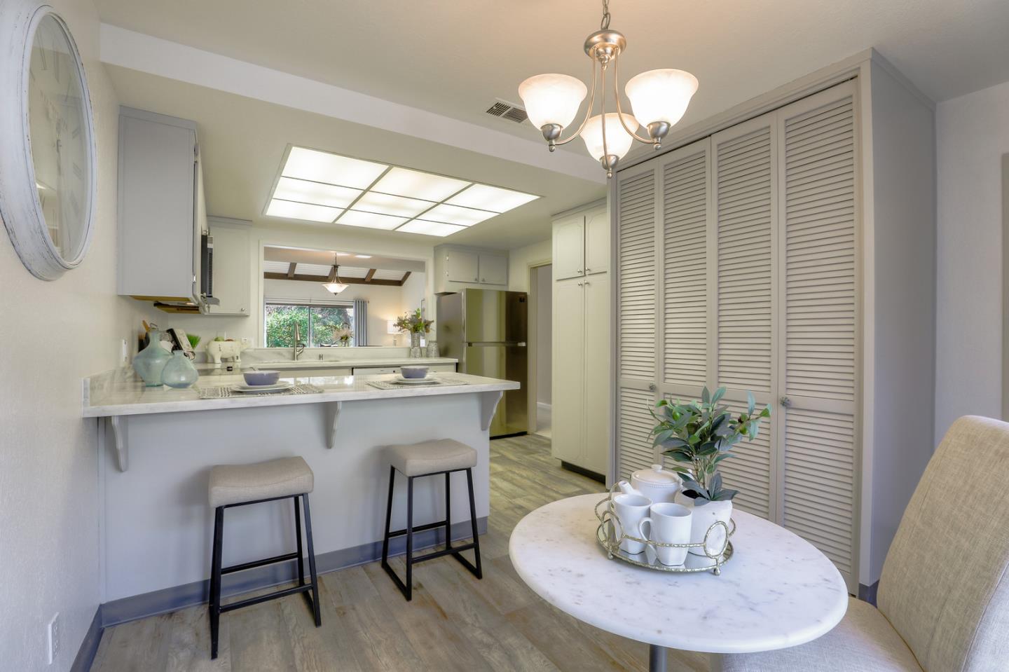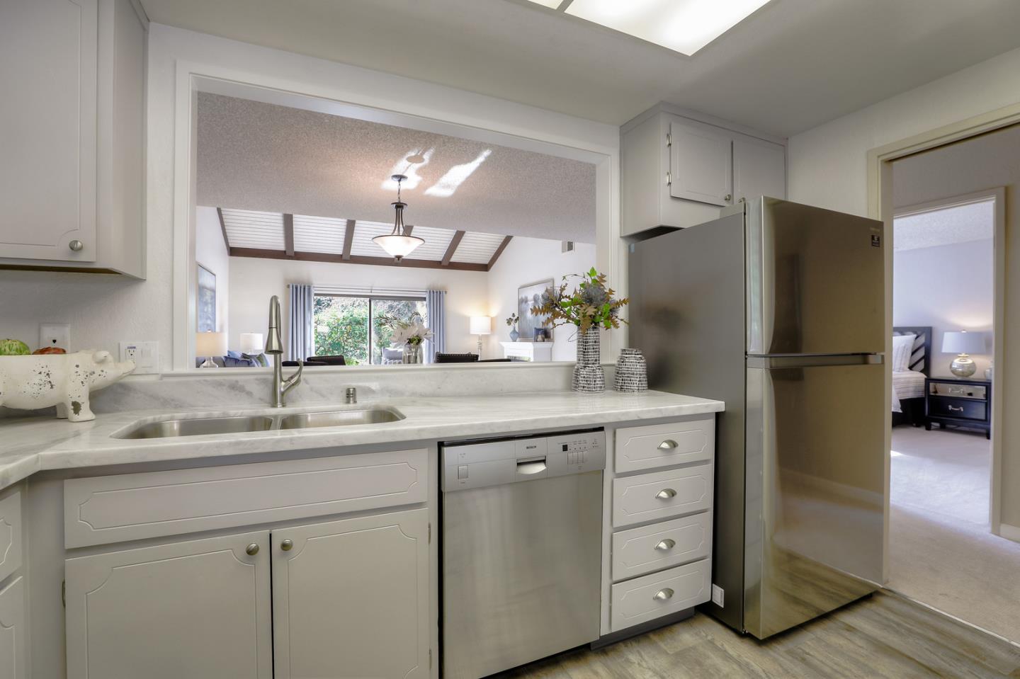 Excellent opportunity to own a beautifully updated 2 bd, 2 ba single level Villa located in a gated resort style community. Once you pass through the private and inviting courtyard, your welcomed with an open, bright and spacious floorplan with many upgrades throughout, including: Updated and freshly painted eat-in kitchen with new marble counters and breakfast bar, stainless steel appliances, lots of storage and laundry facility or office space ~ all opening to a spacious formal dining and living room with vaulted ceilings. Split bedrooms with walk-in closets. Spacious master suite with 2 closets, new sink, faucet, medicine cabinet, toilet and granite counter. Both living room and master bedroom lead to expansive wrap-around patio with surrounding lush landscaping. Beautiful new blinds and curtains, interior door and cabinet hardware and all new flooring and baseboards throughout. Don't miss this home! ONE PERSON MUST BE 55+ TO LIVE AT THE VILLAGES GOLF & COUNTRY CLUB.
